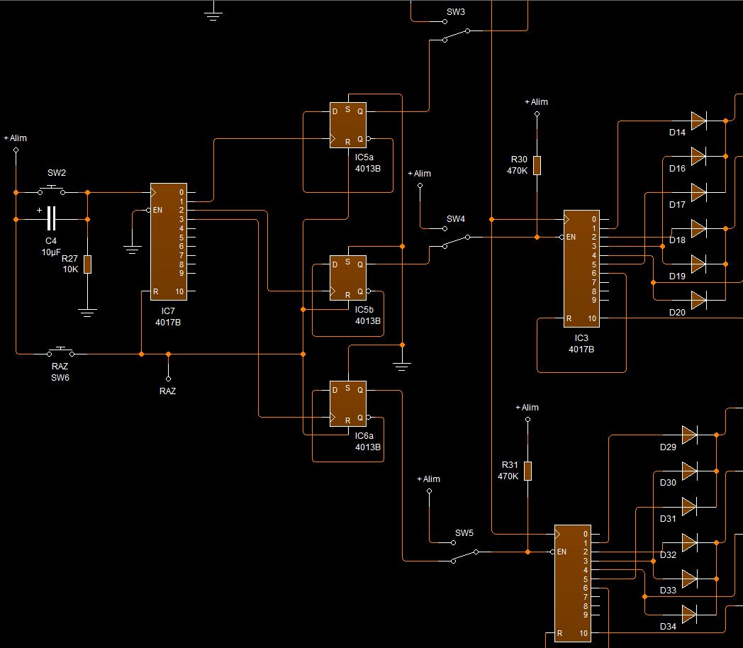Tu remarques les résistances R28,R30,R31 qui mettent l'entrée EN à l'état H en permanence qui ont pour but de supprimer l'état d'incertitude des intérrupteurs lorsque ceux-ci sont actionnés. Les contacts n'étant pas mis instantanément, ce qui perturberait le résultat des dés. L'entrée EN sur le schéma correspond à la broche 13 (clock énable) du CD4017.