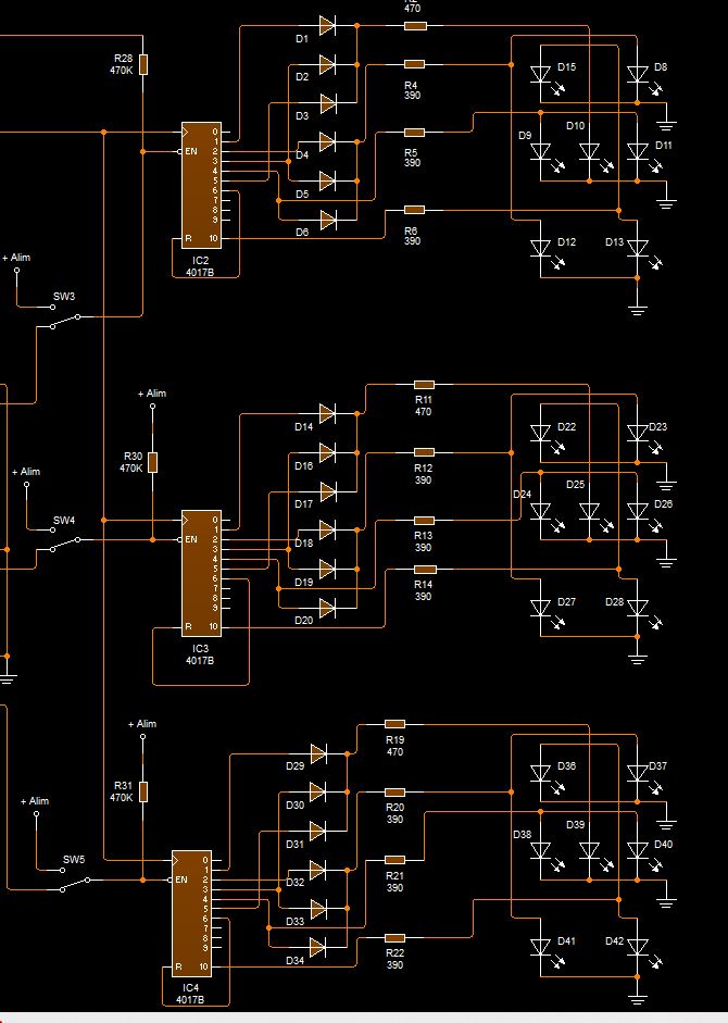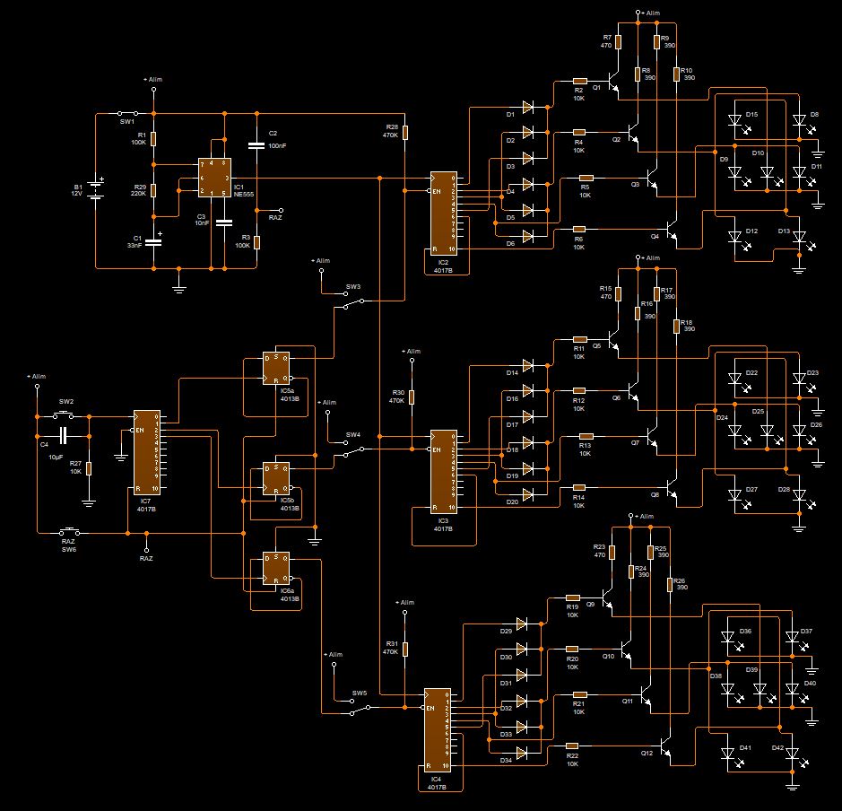 - A noter que les LEDs sont directement polarisées par les CD 4017, leurs luminosités ne seront pas très grandes. Voici un second montages ou les LEDs sont pilotées par des transistors.