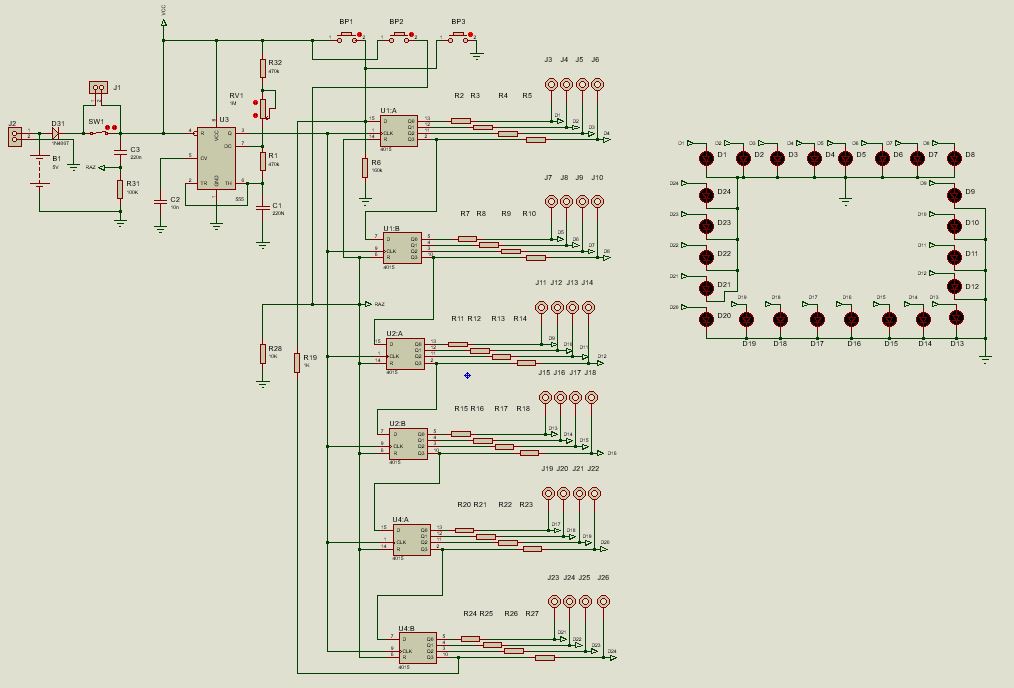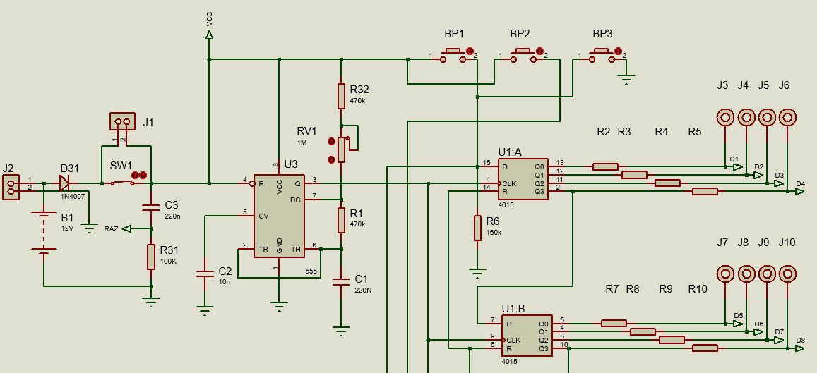 Le poussoir BP1 met un niveau haut sur l'entrée Data ce qui allume les LEDs, le poussoir BP3 met lui un niveau bas sur cette entrée, ce qui à l'effet inverse . Le poussoir BP2 met à zéro le circuit. C3 et R 31 génèrent une impulsion sur l'entrée RAZ des CD 4015 à la mise sous tension du circuit. Les résistances sorties des CD 4015 ont une valeur de 470 ohms.